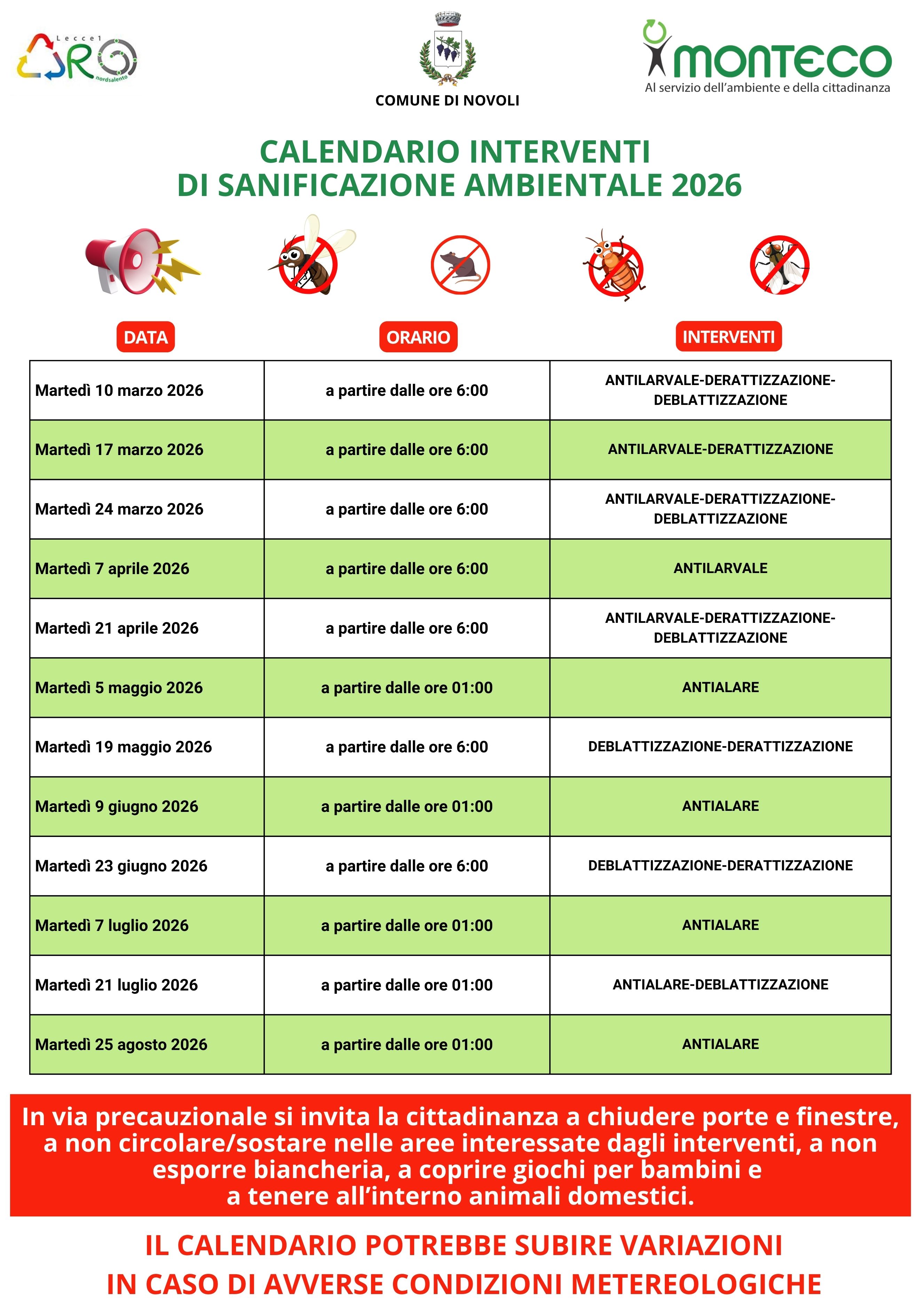 Per le date indicate nel calendario di INTERVENTI DI SANIFICAZIONE AMBIENTALE 2026, si invita tutta la cittadinanza del  Comune di Novoli 𝗮 𝗰𝗵𝗶𝘂𝗱𝗲𝗿𝗲 𝗽𝗼𝗿𝘁𝗲 𝗲 𝗳𝗶𝗻𝗲𝘀𝘁𝗿𝗲, 𝗮 𝗻𝗼𝗻 𝗰𝗶𝗿𝗰𝗼𝗹𝗮𝗿𝗲/𝘀𝗼𝘀𝘁𝗮𝗿𝗲 𝗻𝗲𝗹𝗹𝗲 𝗮𝗿𝗲𝗲 𝗶𝗻𝘁𝗲𝗿𝗲𝘀𝘀𝗮𝘁𝗲 𝗱𝗮𝗴𝗹𝗶 𝗶𝗻𝘁𝗲𝗿𝘃𝗲𝗻𝘁𝗶, 𝗮 𝗻𝗼𝗻 𝗲𝘀𝗽𝗼𝗿𝗿𝗲 𝗯𝗶𝗮𝗻𝗰𝗵𝗲𝗿𝗶𝗮, 𝗮 𝗰𝗼𝗽𝗿𝗶𝗿𝗲 𝗴𝗶𝗼𝗰𝗵𝗶 𝗽𝗲𝗿 𝗯𝗮𝗺𝗯𝗶𝗻𝗶 𝗲 𝗮 𝘁𝗲𝗻𝗲𝗿𝗲 𝗮𝗹𝗹'𝗶𝗻𝘁𝗲𝗿𝗻𝗼 𝗮𝗻𝗶𝗺𝗮𝗹𝗶 𝗱𝗼𝗺𝗲𝘀𝘁𝗶𝗰𝗶.